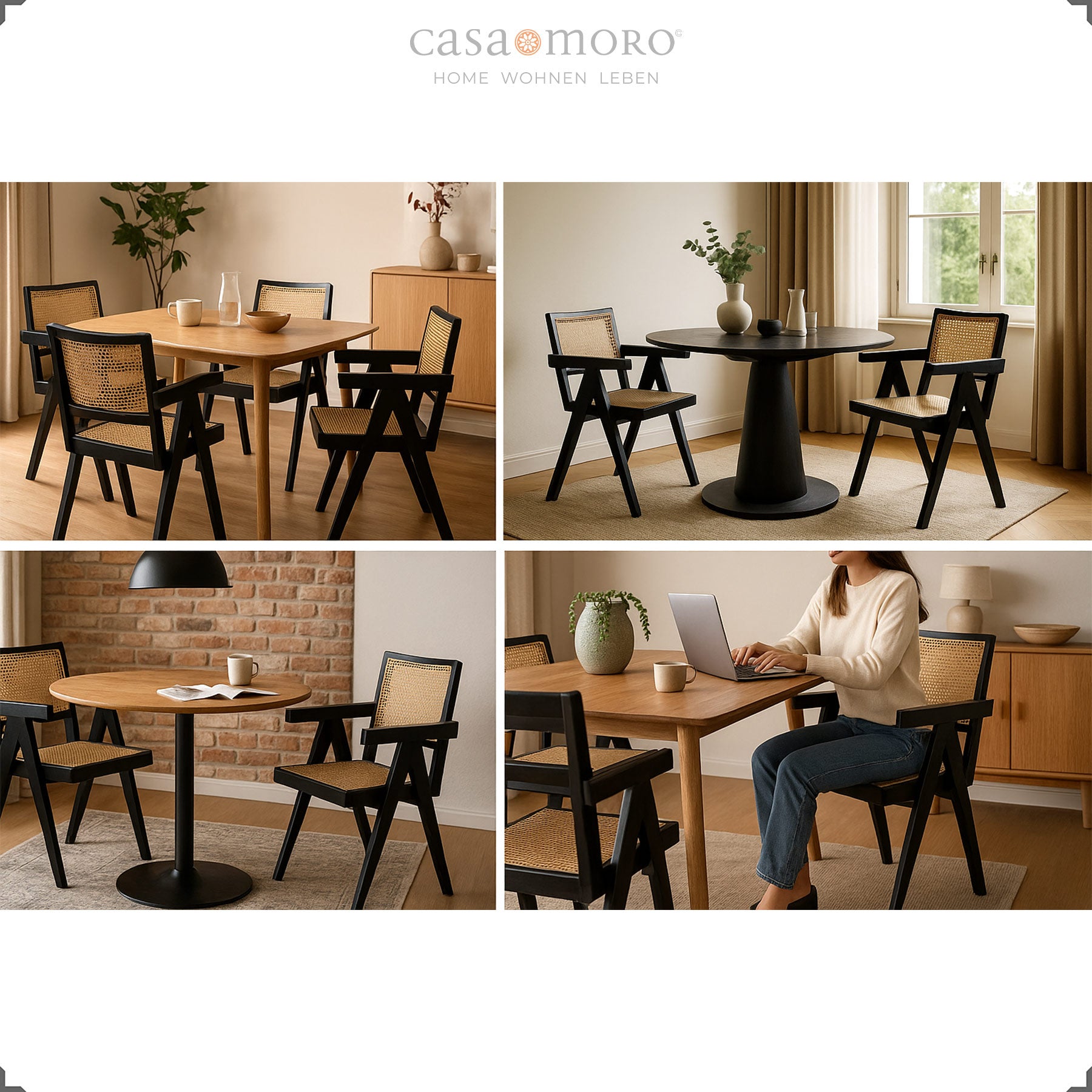 Modern dining group with black armchairs made of teak and Viennese wicker, combined with a light wooden table