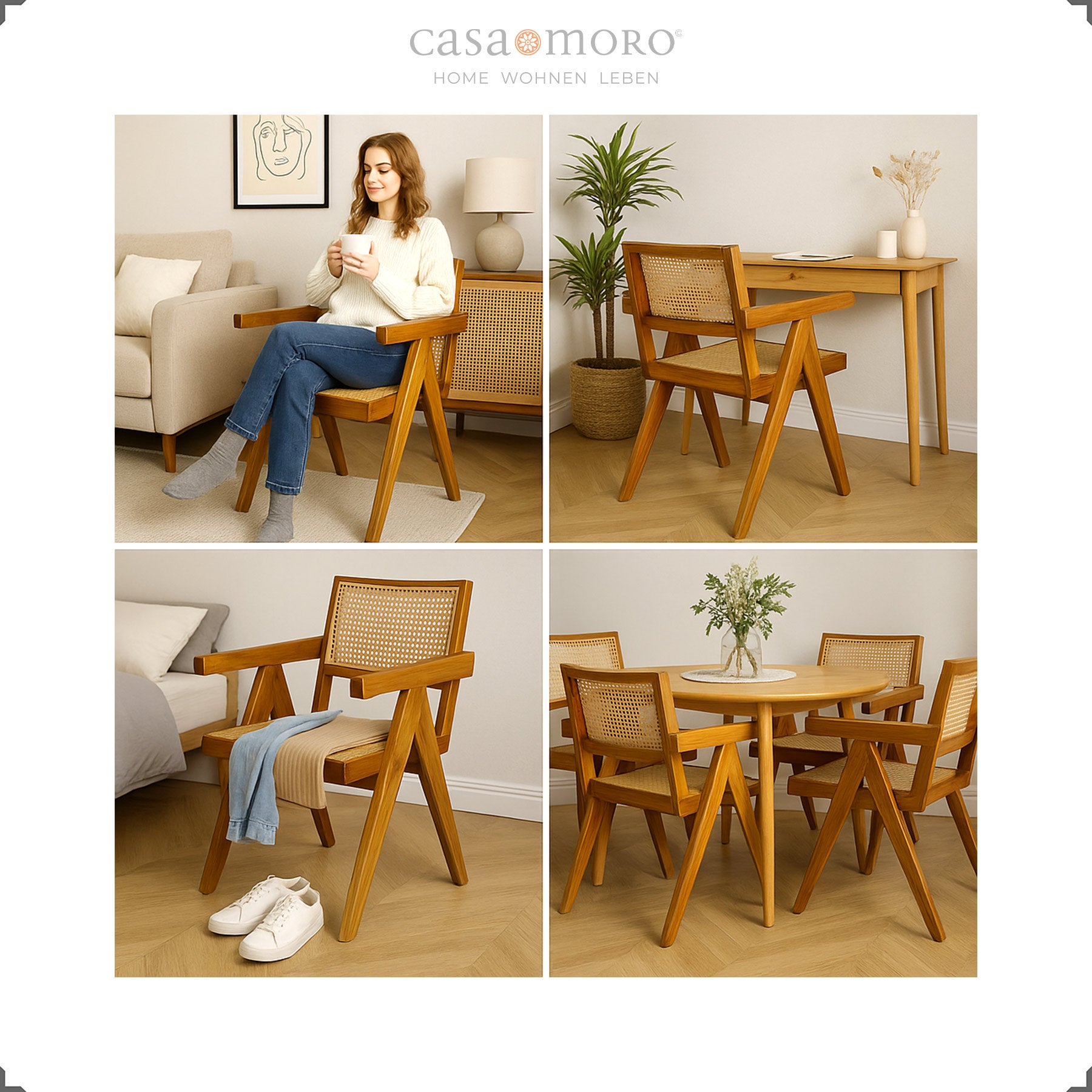 The armchair with Viennese cane weaving combines authentic craftsmanship with modern design. The solid teak frame has a sculptural and warm appearance, while the seat and backrest made of woven rattan provide lightness and comfort. Its clear design language is reminiscent of iconic design classics and blends effortlessly into a wide variety of interior styles – from modern to Scandinavian.