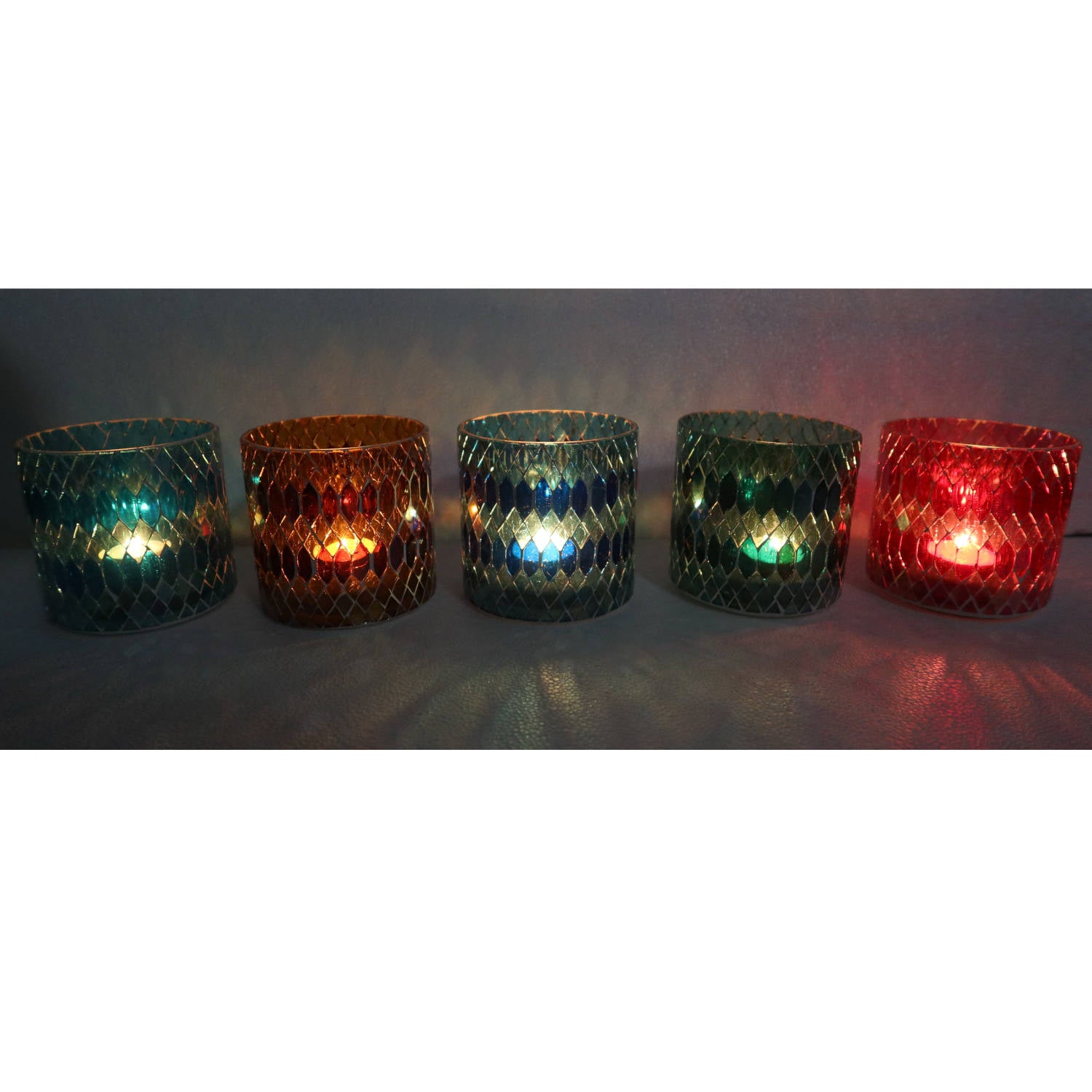Decorative mosaic glass lantern, tea light holder set in 5 colors: light blue, dark blue, red, yellow, and green. The colorful glasses are decorated by hand on the outside with small mosaic glass stones, making each mosaic glass lanternunique. Whether in the living room asa table decoration, on the terrace as a garden lantern, in the bedroom asmood lighting, or as a candlestick in your restaurant, hotel, or lounge—themosaic lanterns always create an atmospheric ambience and become adecorative highlight that no one can resist.