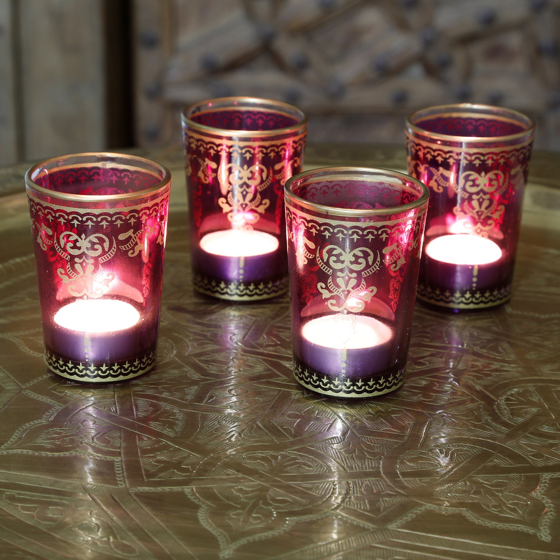 The violet-purple glass candle holders are a maritime table decoration for any room. The tealight glasses have a cylindrical shape and are finished in violet-purple and gold. A gold rim runs around the upper edge of the candle holders, aesthetically rounding off the design. The surface of the candle holders features delicate gold patterns with a floral appearance.