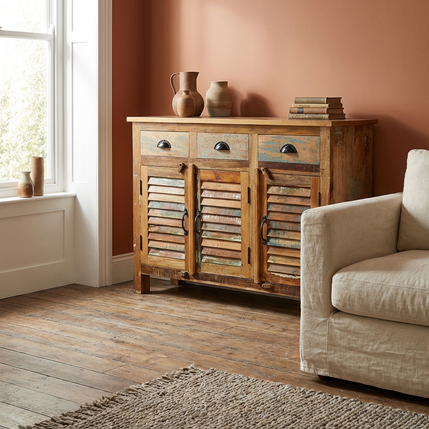 Made from reclaimed mango wood, this highboard is made from wood that has already been used. The material comes from fallen trees, old boats and beams, floors and support beams from demolished buildings. This origin shapes the surface with traces, color transitions and a natural depth that makes solid wood appear so authentic.
