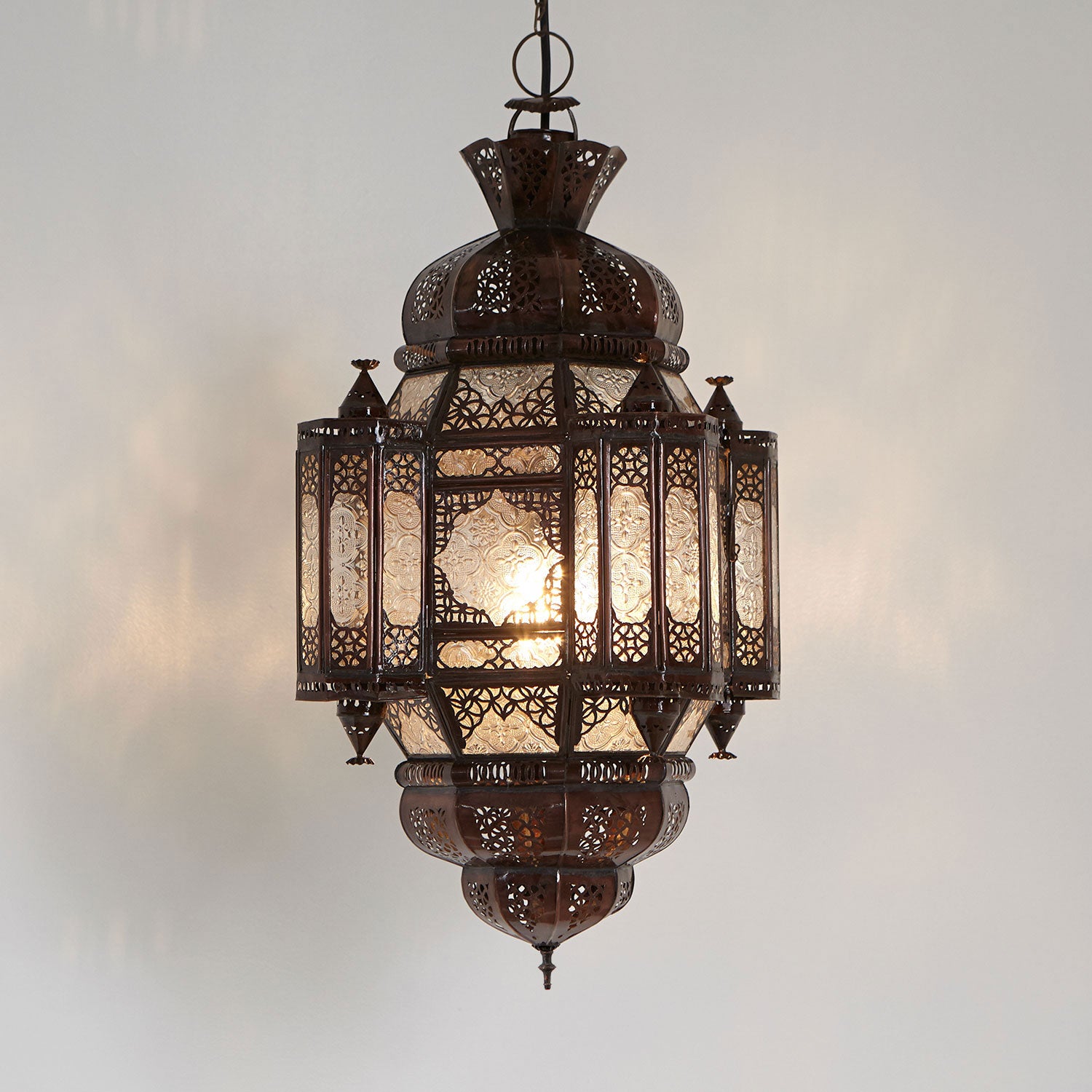 The "Moula-Maurice" reflects the Orient in each of its patterns. The elaborately crafted cutouts harmonize very well with the clear glass used. ThisMoroccan lantern/pendant lamphas four bay windows that can be opened and offer the possibility of using tea lights.