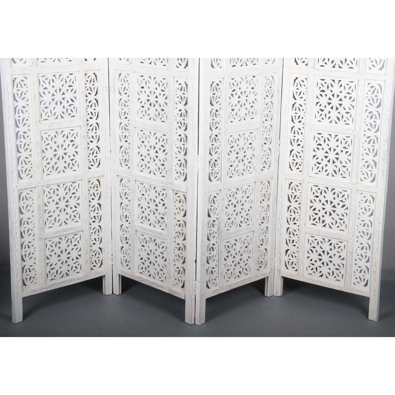 The Indian Elyes screen is hand-carved from mango wood and MDF wood and features traditional floral motifs. It consists of four panels. With its elegant white panels, this folding screen suits almost any interior design style. This room divider is a modern and elegant solution for dividing your living space according to your wishes.