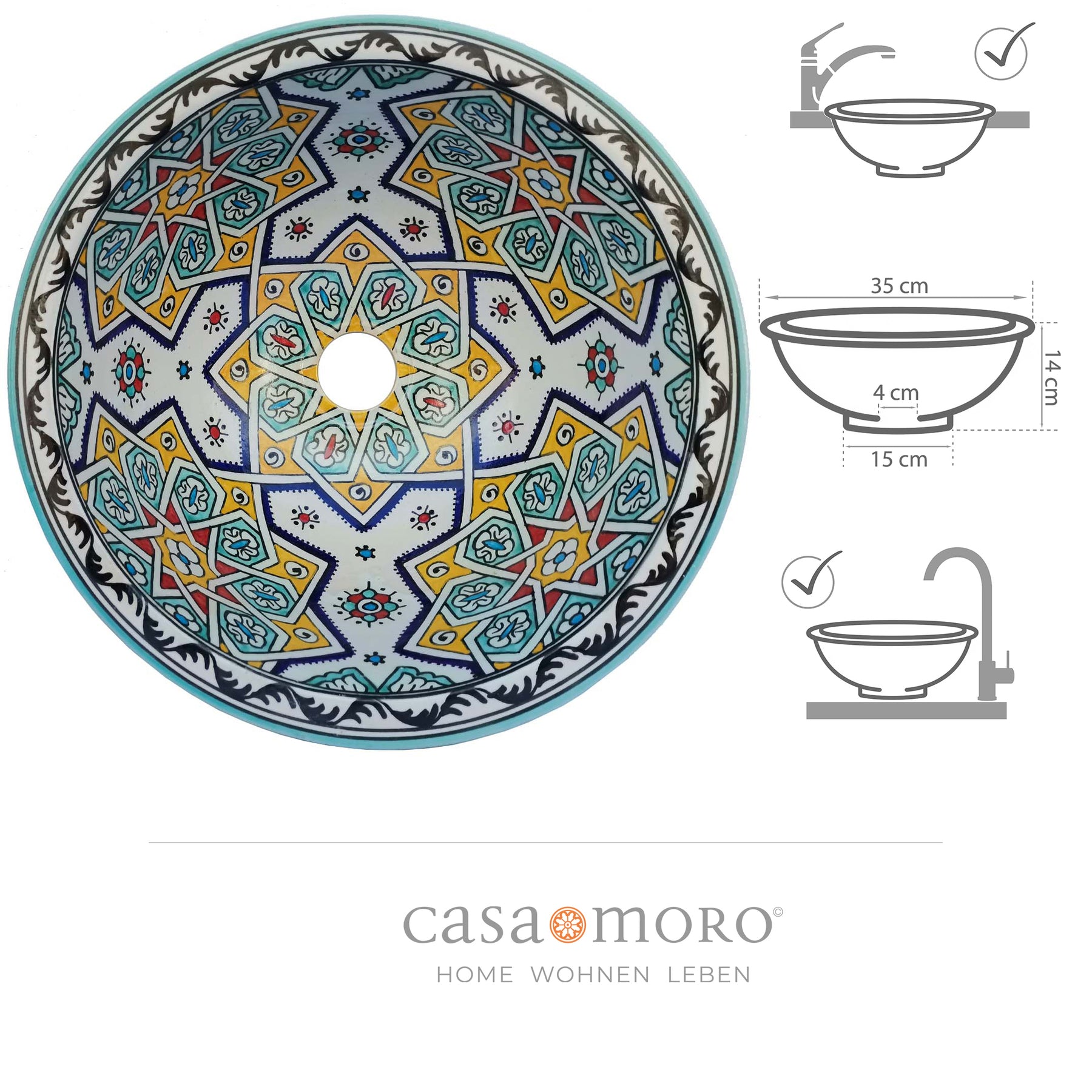 This round countertop washbasin brings the centuries-old pottery art of Fez directly into your bathroom. Fez is considered the stronghold of Moroccan ceramic art – where artistically painted washbasins are still produced today in elaborate handcraft. Each countertop basin is a unique piece that combines traditional aesthetics and timeless elegance on your vanity.