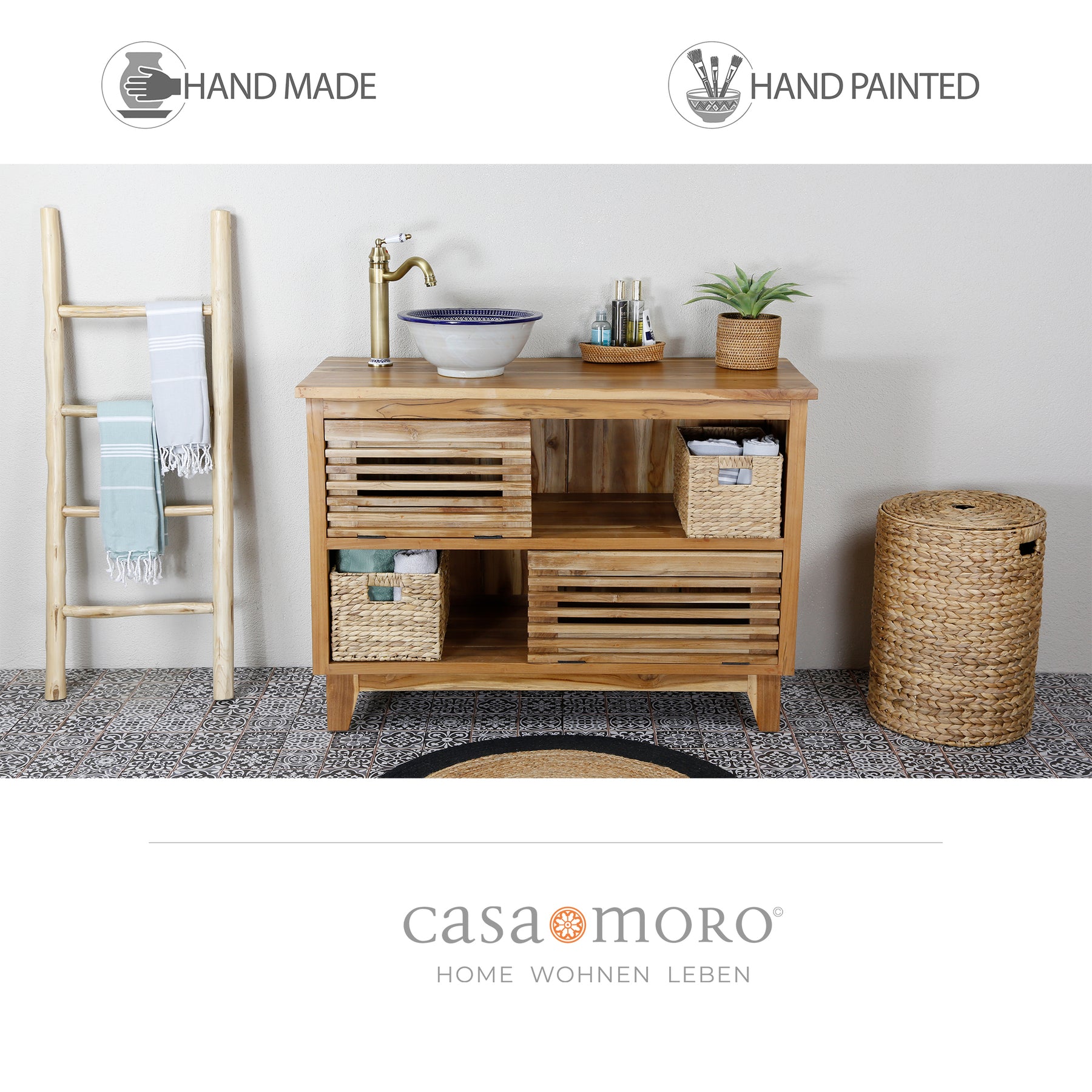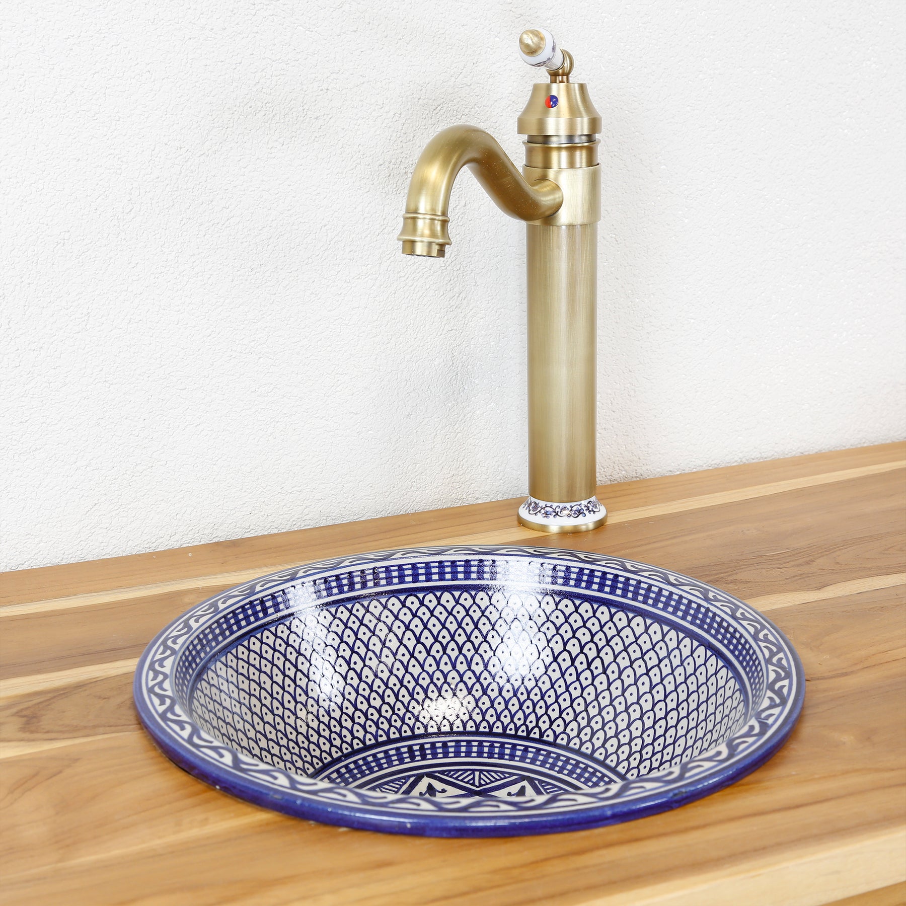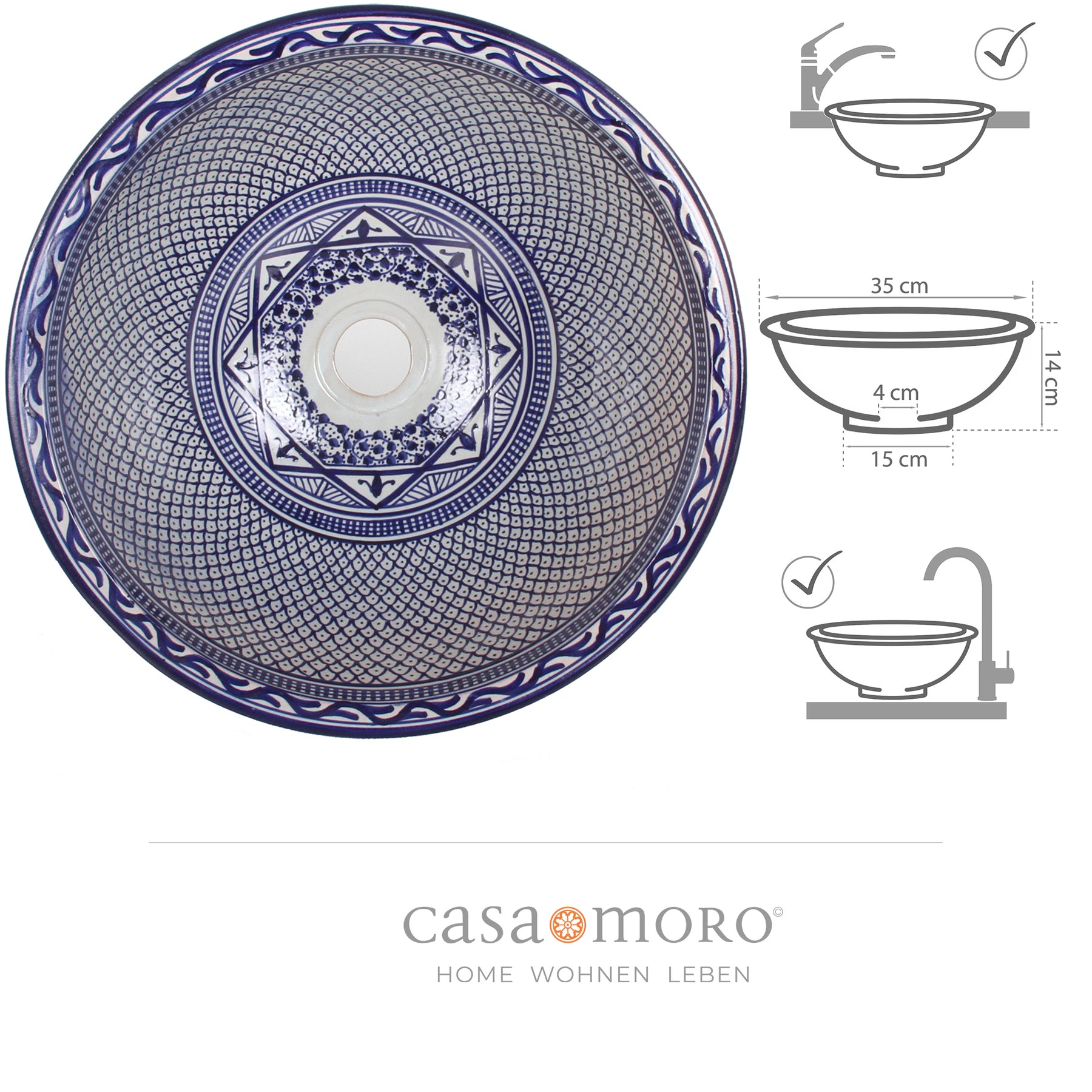 This round countertop sink brings the traditional pottery art of Fez directly into your home – ideal for the bathroom or as a stylish sink in the guest WC. For centuries, Fez has been the center of Moorish ceramic production – even today, washbasins are still shaped by hand, hand-painted, and fired in traditional kilns. Each countertop washbasin is truly unique, with a timeless appeal and artistic hand-painting.