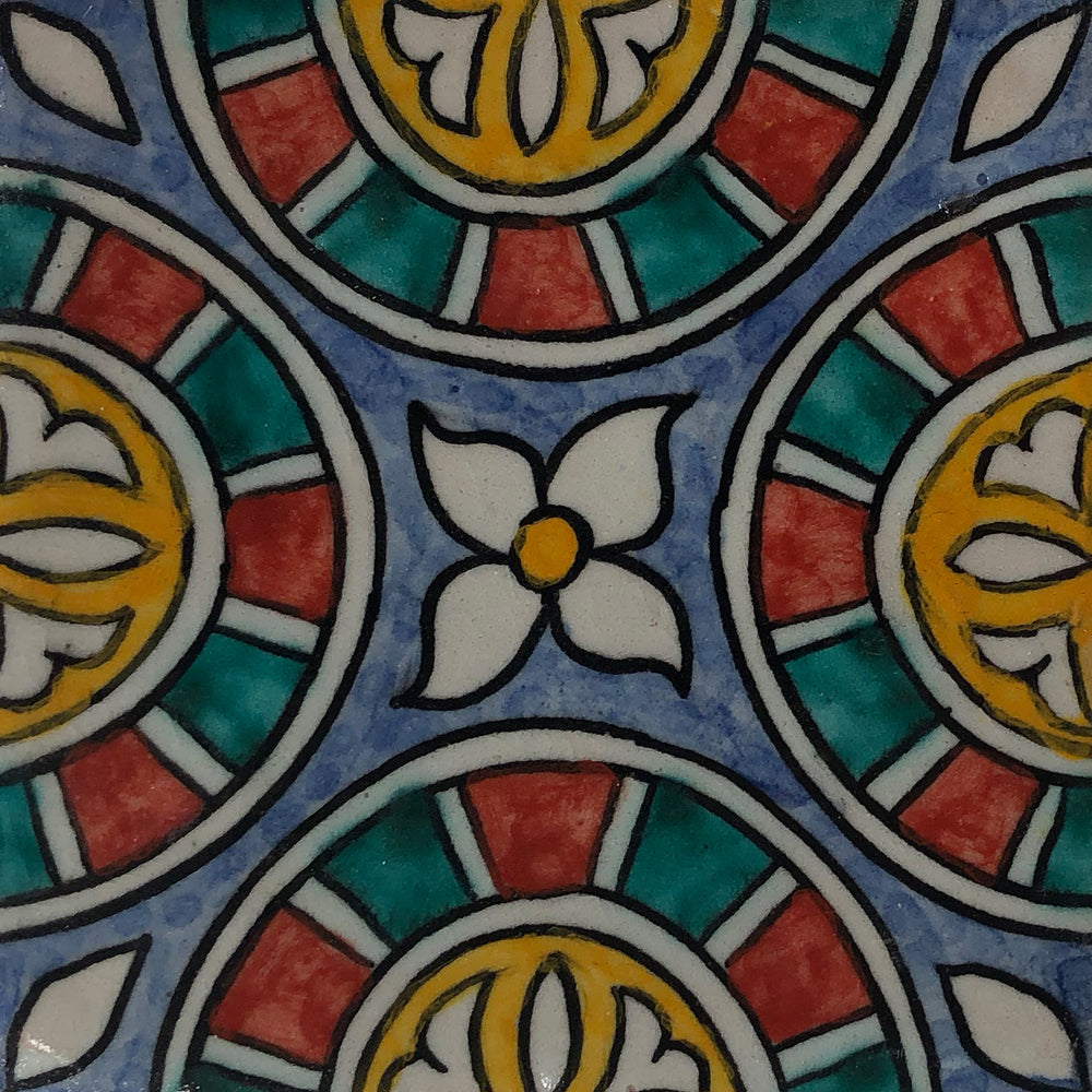 This hand-painted ceramic tile features a vibrant ornament of circles, floral shapes and geometric elements in bold colors such as blue, red, green and yellow. The harmonious color composition is reminiscent of Mediterranean tile patterns found in traditional courtyards, patios or historic houses around the Mediterranean. The fine dark lines that outline every detail are typical of hand-painted Moroccan tiles.