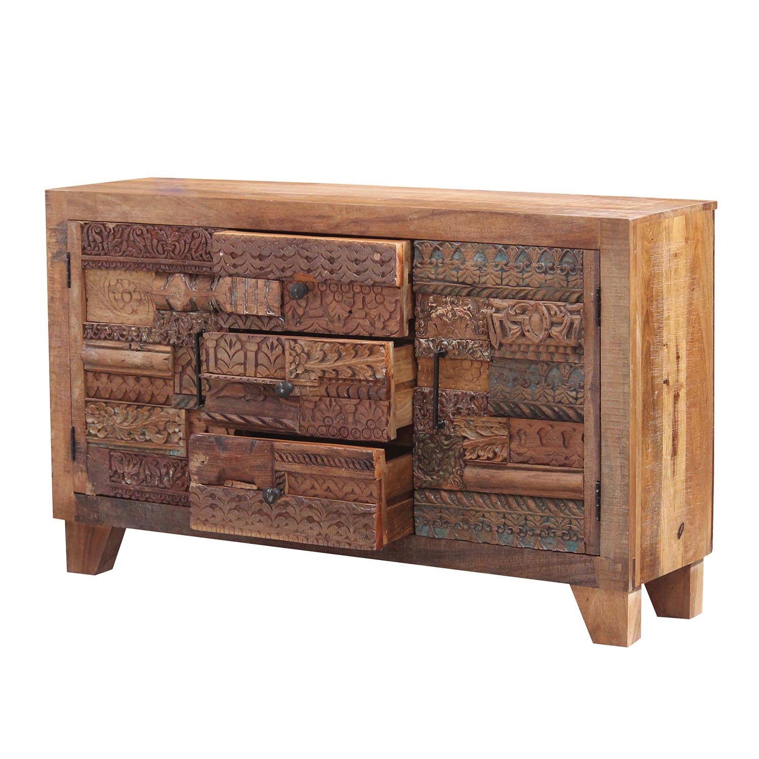 The chest of drawers offers plenty of storage space thanks to its 2 doors and 3 drawers – the space behind the doors is divided by a shelf. The combination of hand-carved ornaments and imaginative motifs gives the chest a mysterious, mystical look!