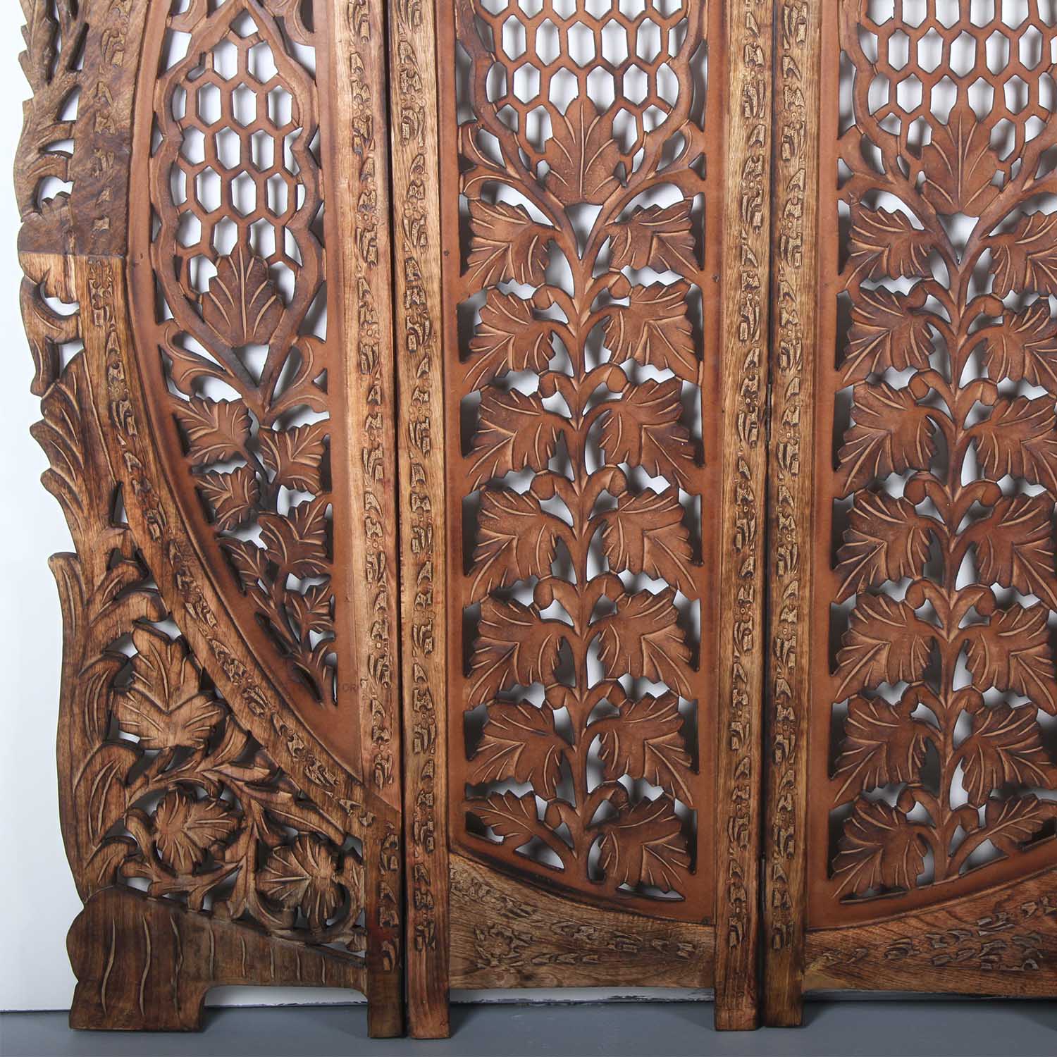 The Indian Samrina screen is hand-carved from mango wood and MDF and decorated with traditional floral motifs. It consists of four panels. With its elegant brown panels, this folding screen suits almost any interior design style. This room divider is a modern and elegant solution for dividing your living space according to your wishes.