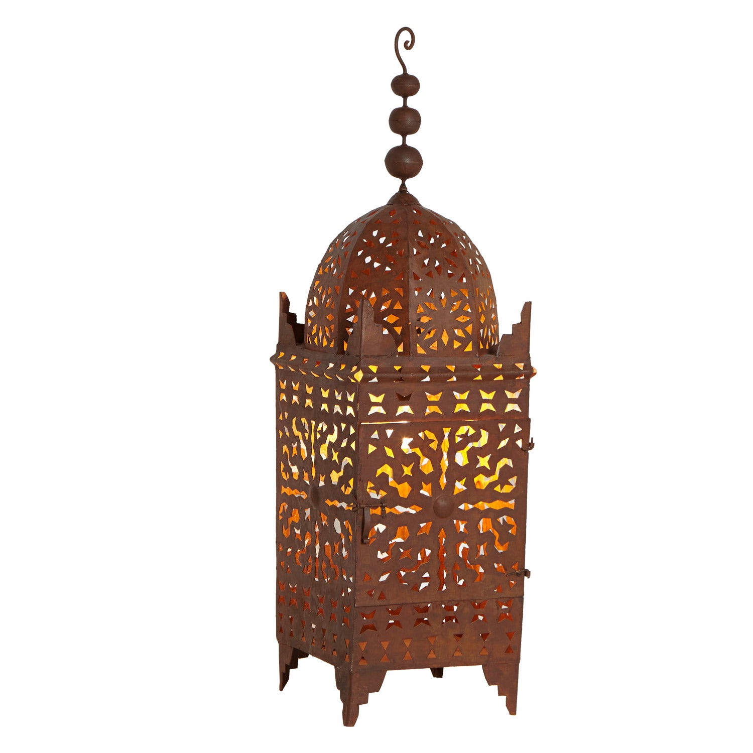 "Moroccan iron lanterns of this type cast unique patterns of light and shadow. Their minaret structure and countless cutouts refract the light into many small points, creating a magical atmosphere."