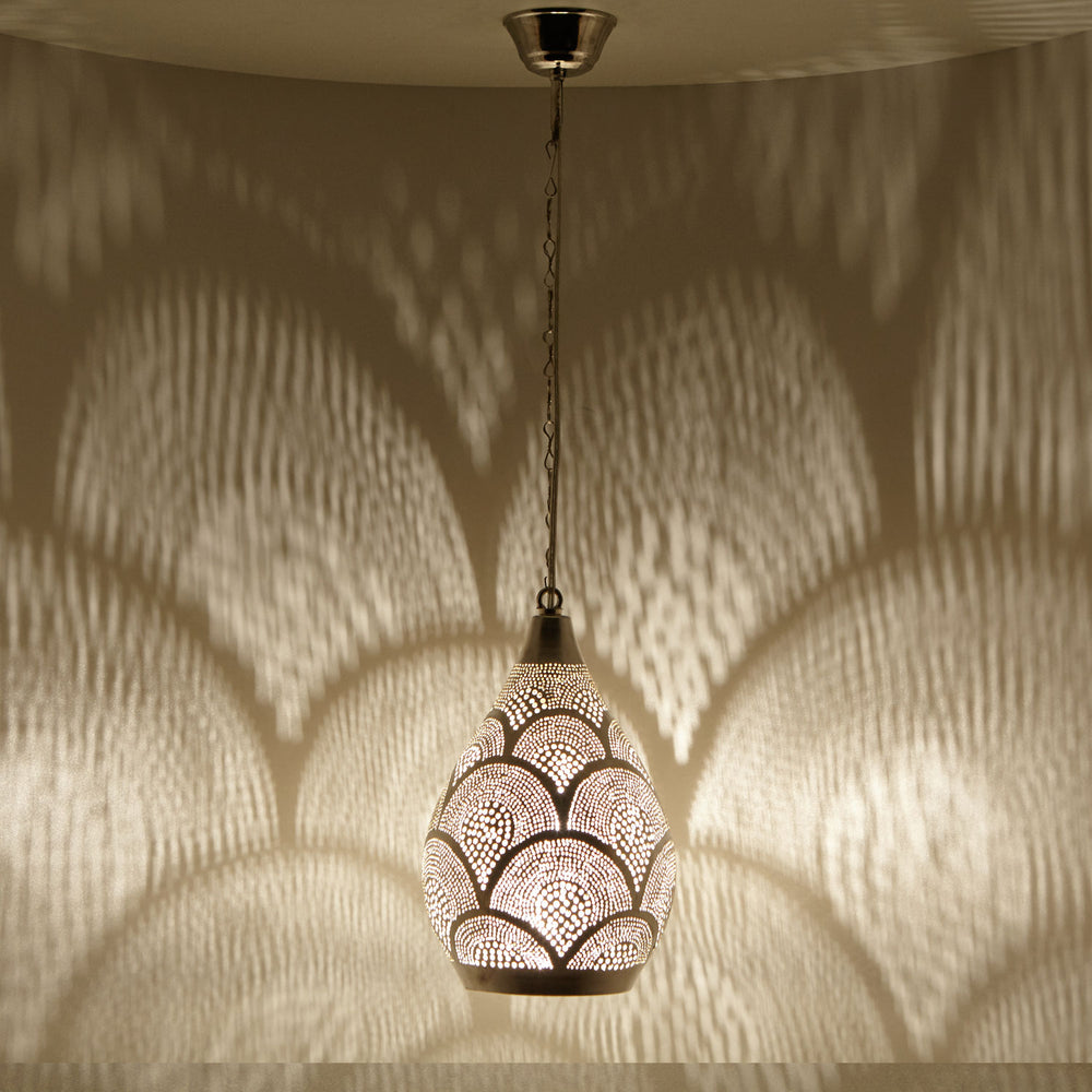 Our Moroccan lamp Naouma Samak D17 is a beautiful oriental light fixture that has been carefully crafted by hand. With its timeless, uniform pattern, this eye-catching piece from the Orient fits perfectly into any room and looks particularly luxurious thanks to its genuine silver-plated brass!