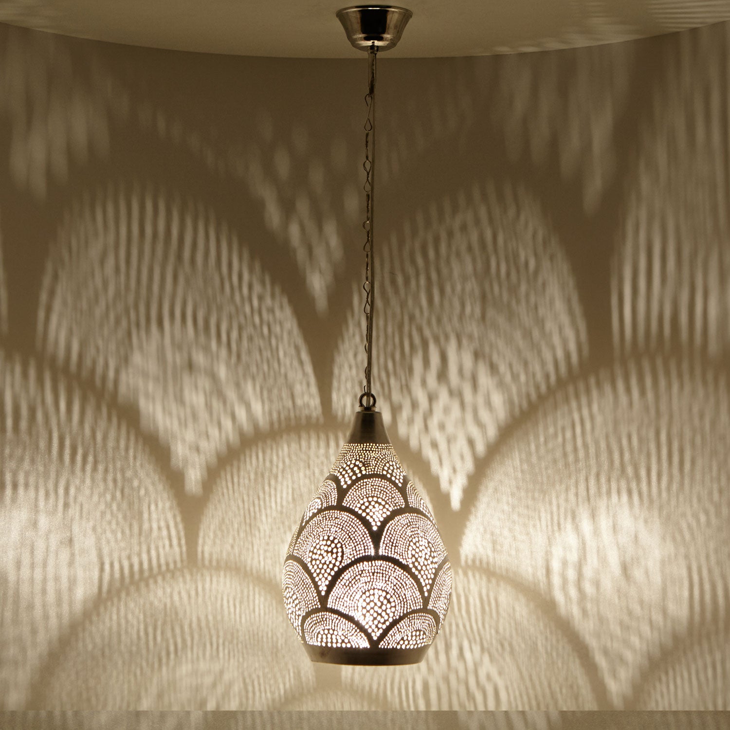 The hanging lamp creates a cozy atmosphere in every corner and every room with its enchanting shadows! Whether above the dining table, in the bedroom or living room, whether Mediterranean, oriental or modern—with our silver-plated Egyptian lamp, you can embark on a journey to the Orient and be enchanted by delicate shadows—an eye-catcher that is a must-have in your living area!