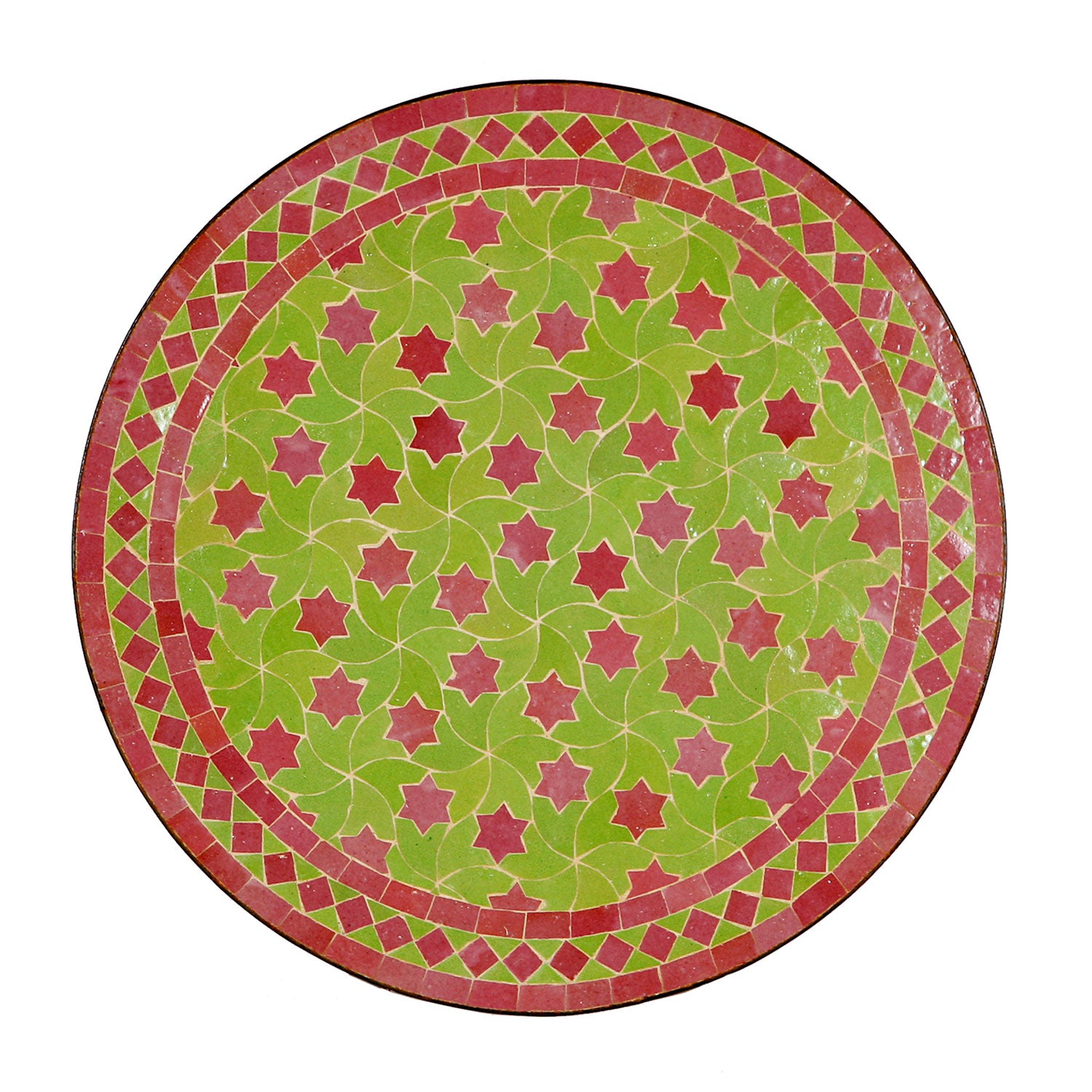 What would a fairy tale from 1001 Nights be without a starry sky? With this beautiful mosaic table, the stars are within reach. Take a look at the sophisticated pattern: the mosaic artist placed a different colored six-pointed star in the center of each curved triangle and had six of these shapes meet at their tips. Only at second glance does the apparent randomness of the ornament become apparent. The mosaic is modern, but the crafting of the tesserae (mosaic pieces) from glazed Zellige tiles and the setting by hand follow ancient traditions.