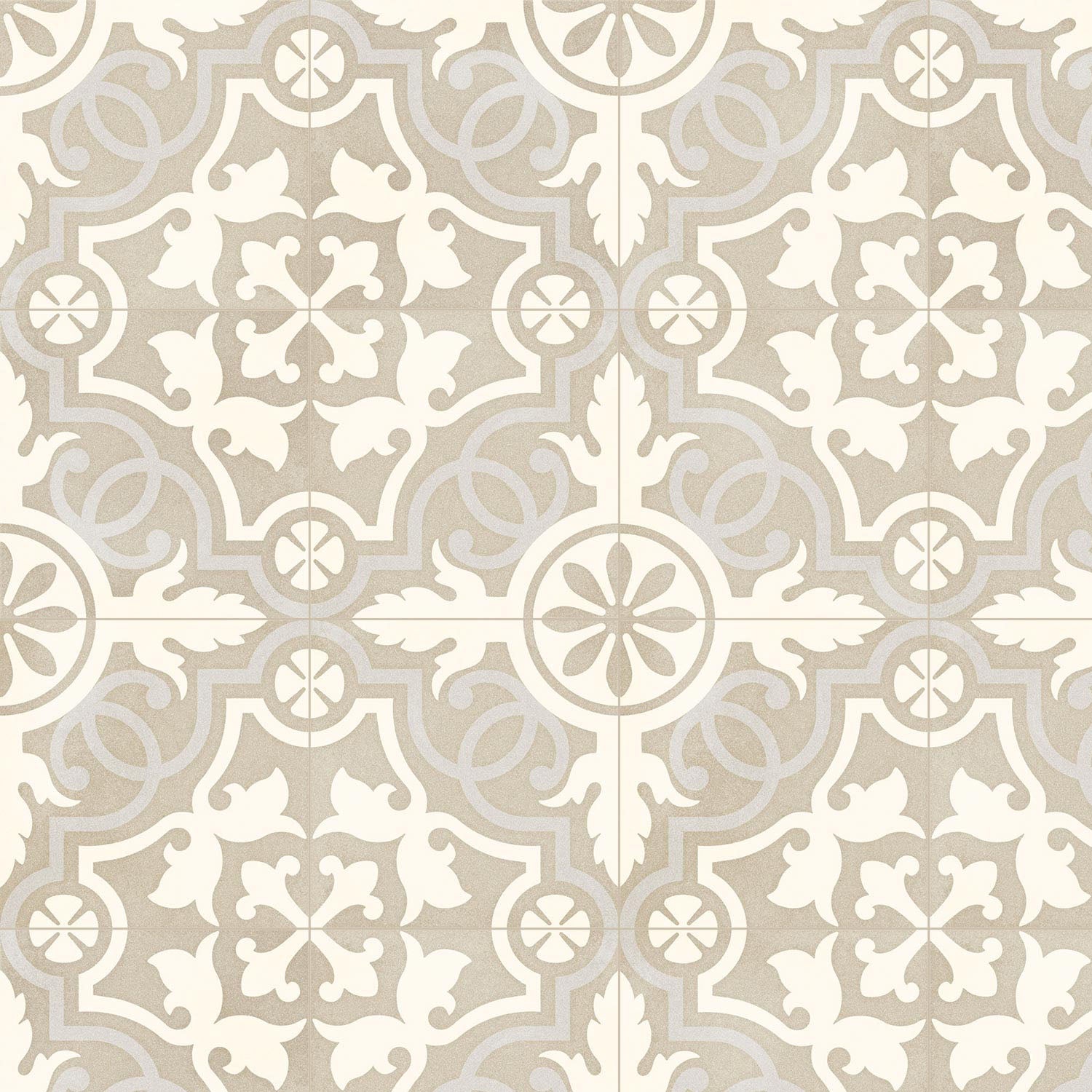 The handcrafted production of Moroccan cement tiles has a long tradition. Their ornamental design in warm, natural colors is particularly appreciated. This Moroccan-inspired tile reinterprets this classic aesthetic: soft beige and sand tones are reminiscent of Mediterranean landscapes and create a calm, elegant atmosphere.