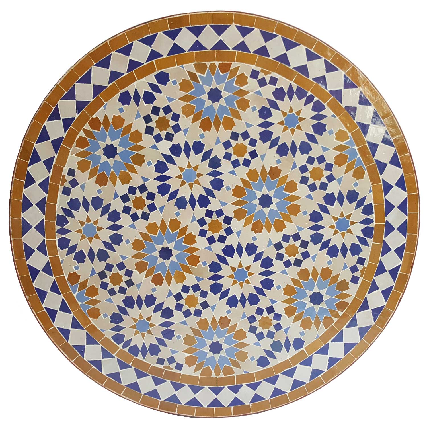 This mosaic table features two very different shades of blue: light blue and dark blue. The blue brings out the brilliance of the ochre-colored Zellige tiles even better. The diamond border is in white/blue. Choose this mosaic table if you want an eye-catching feature in your garden. Another beautiful aspect is that the mosaic invites you to explore its diversity.