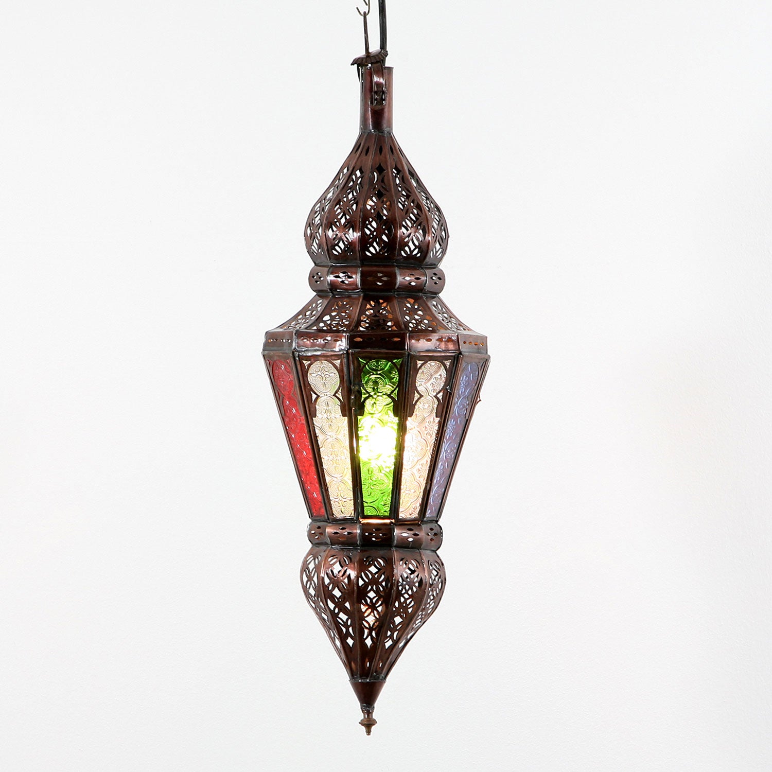 The elegant and mystical light of this oriental lantern / pendant lamp creates a cozy atmosphere. Handcrafted by artisans, the "Nura" is made of patinated iron and inset relief stained glass. The delicate cutouts in the iron radiate the elegance of the Orient.
