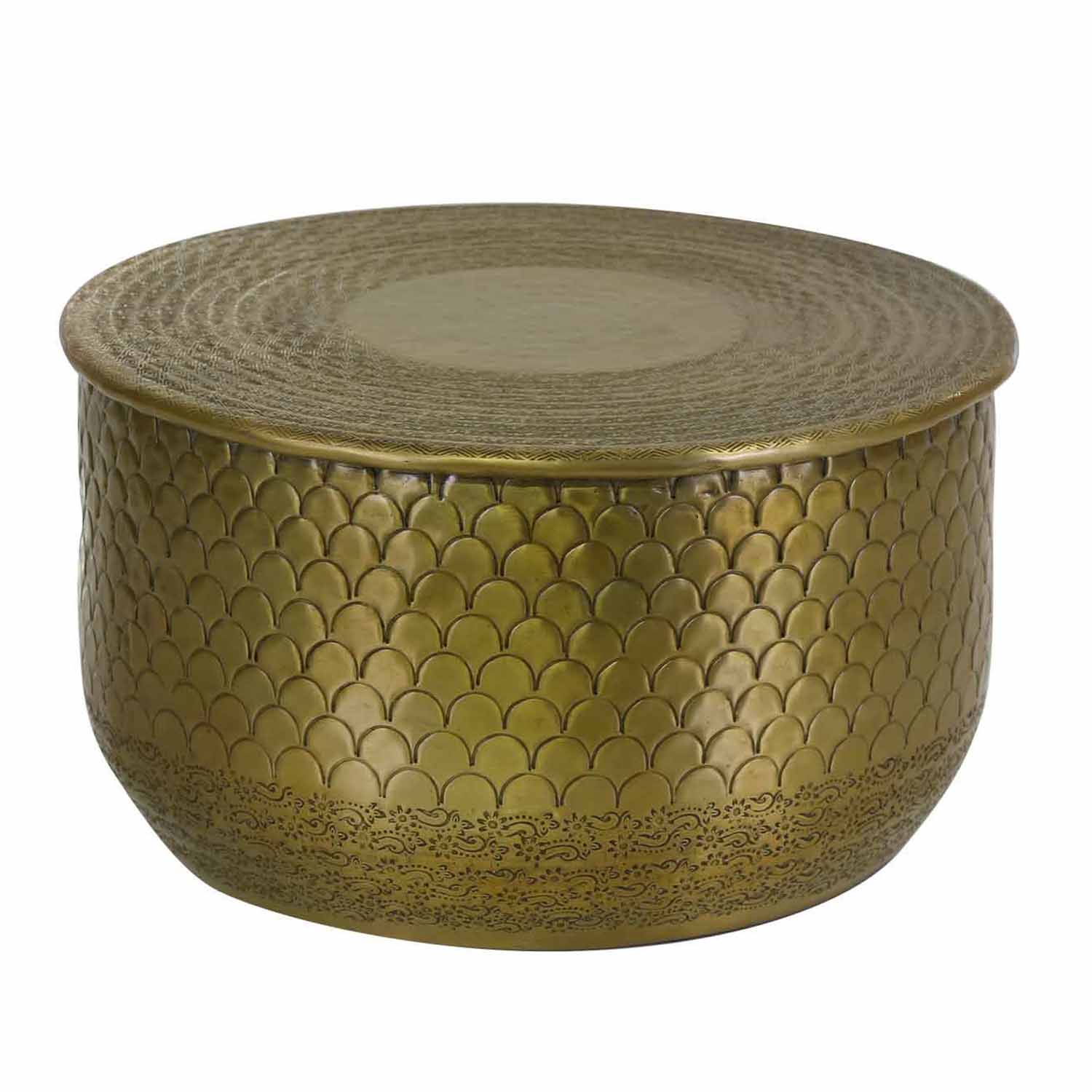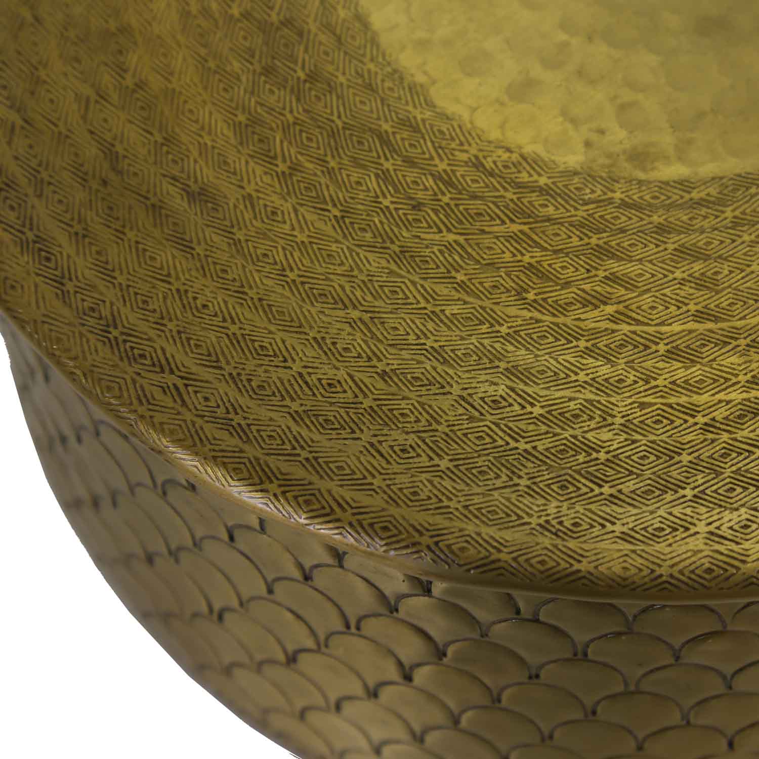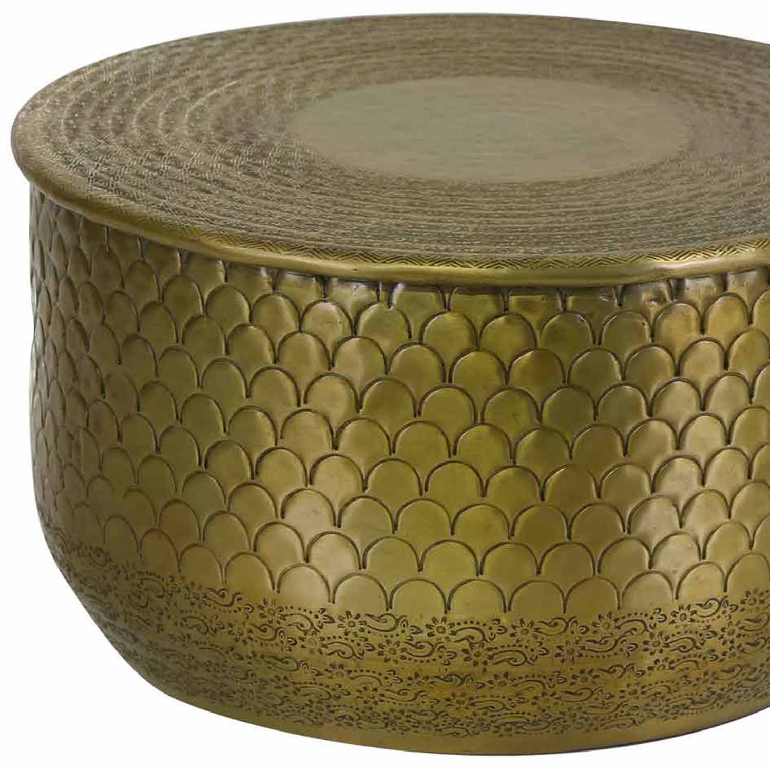 A very high quality side table Alava Gold Made of aluminum decorated with oriental ornaments. A piece of furniture that you don't see every day. The oriental table with Hammered optics looks particularly good in the living room as a coffee table, or as a storage table in the study or as a shisha table for your lounge. The decorative object is a guaranteed one Highlight and will be the one Eye-catcher be in every room. It can also be used as a flower table, tea table, bedside table, storage table, lamp or telephone stand.