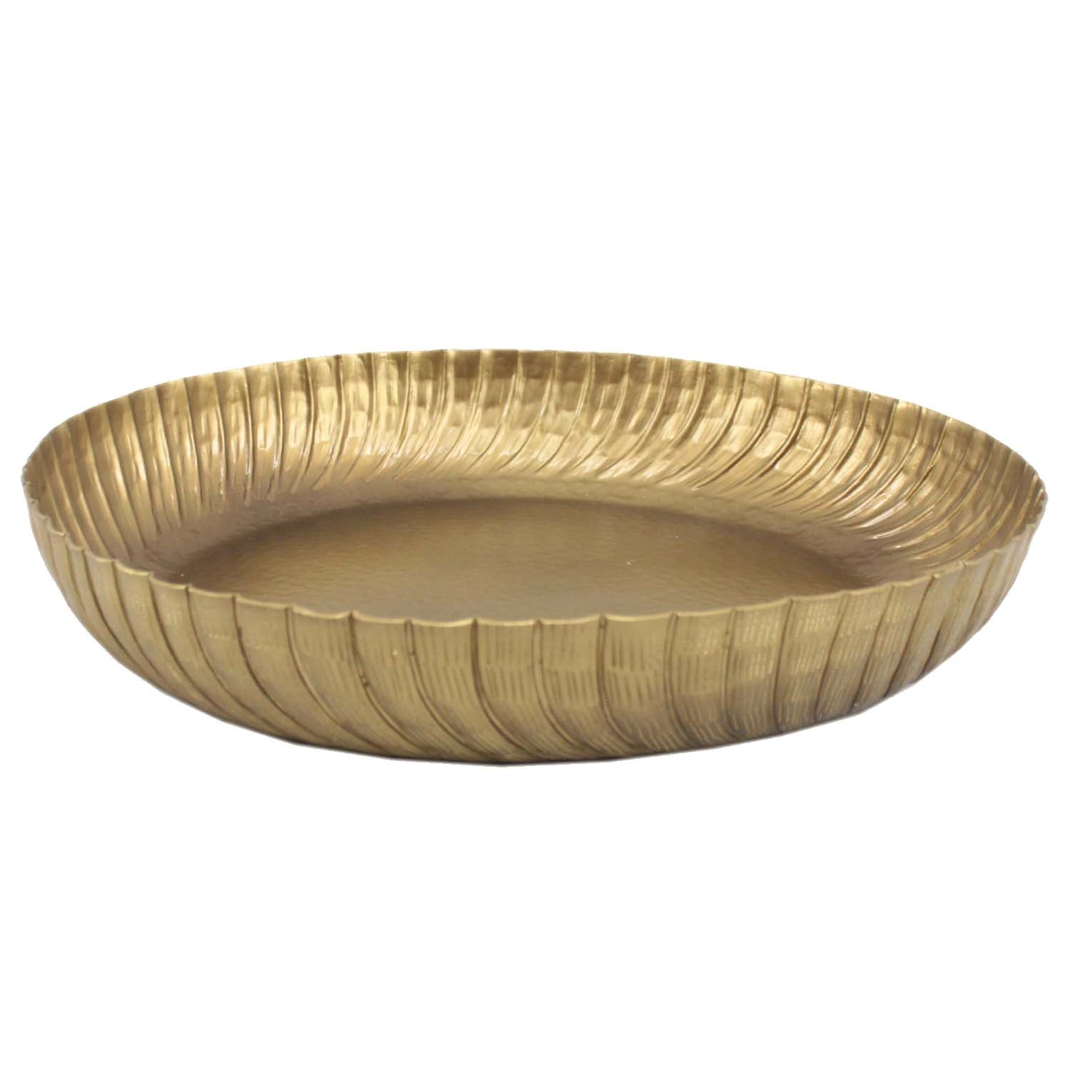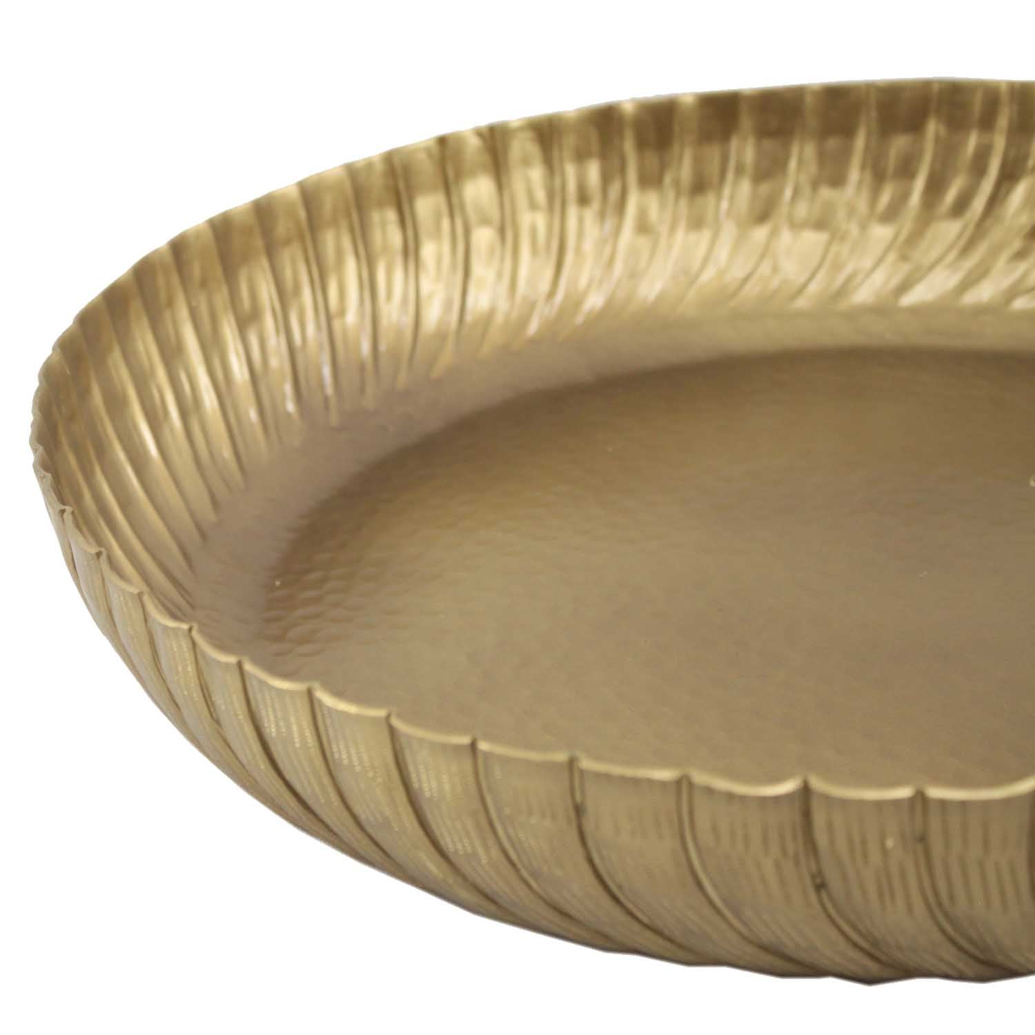 The aluminum serving tray"Loubna" is made by hand in the true oriental tradition and finished with a subtle antique gold look. The bottom of the gold tray has been finished with a hammered effect. The high, wave-shaped rim is a real eye-catcher.