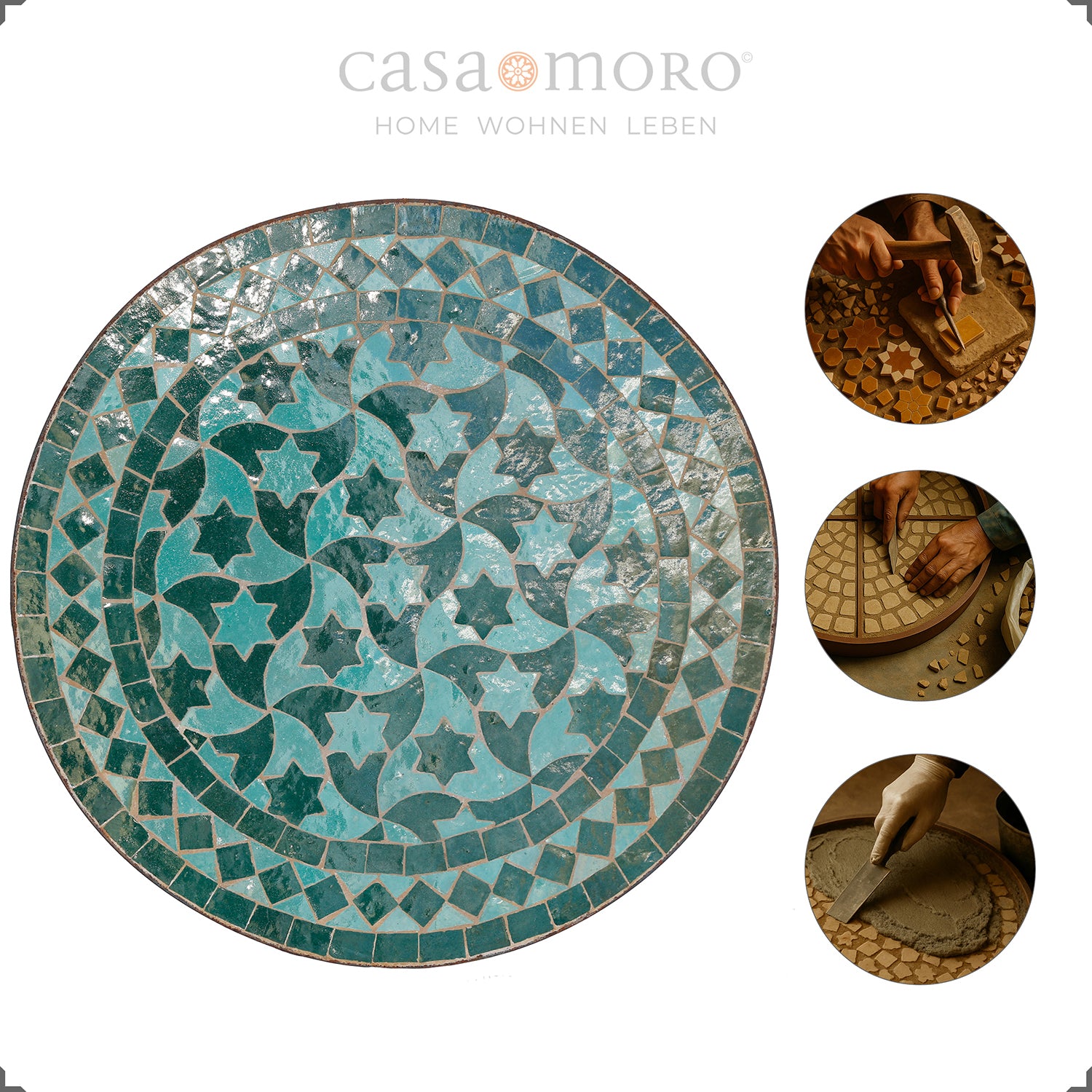 A compact side table with a diameter of 45 cm, which becomes a decorative centerpiece with its green-glazed star pattern in Moroccan Zellige technique. Whether in the living room, on the terrace, or in the kitchen corner – this table brings movement and depth to any room.
