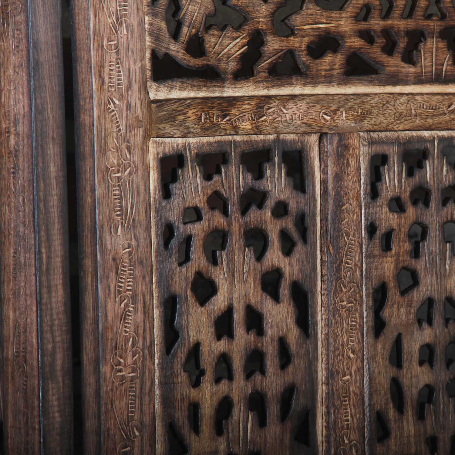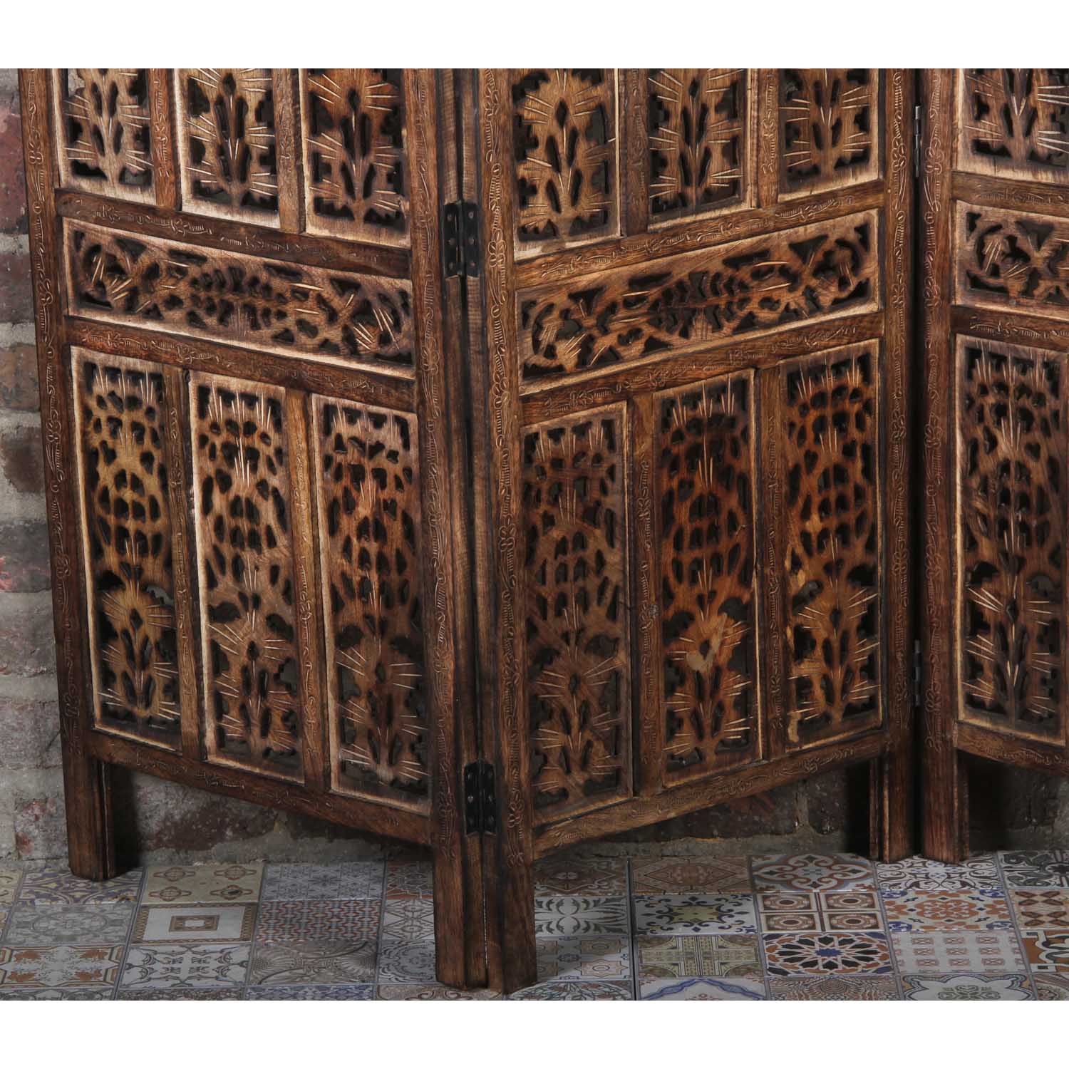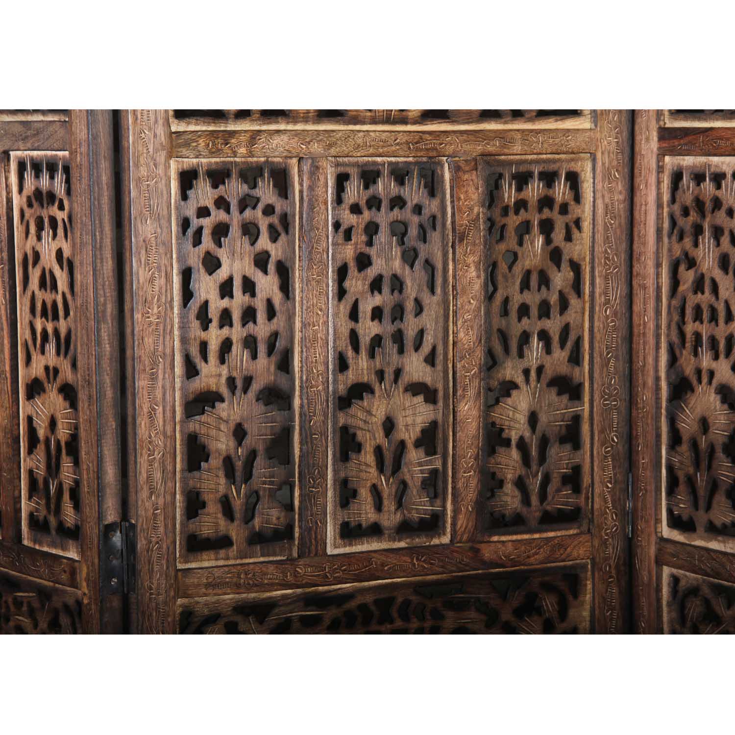 The Indian Firdaus screen is hand-carved from mango wood and MDF and decorated with traditional floral motifs. It consists of four panels. With its elegant brown panels, this folding screen suits almost any interior design style. This room divider is a modern and elegant solution for dividing your living space according to your wishes.